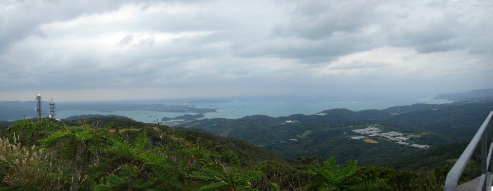 今帰仁城跡の見学後、505号をひたすら南下。約40kmで多野岳385mの頂上にある「いこいの村おきなわ」に6時35分頃到着。霧が立ちこめ て全く視界が効かないところもあった。パラグライダーの発着場、キャンプ場、各種スポーツも可能な大きな施設である。羽地内海が一望できる。お天気が好け れば青い珊瑚礁も見えるのではないか。