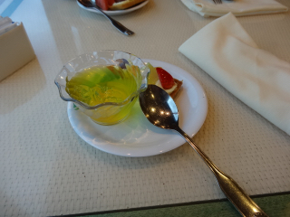 ム入りのオムレツ、フルーツヨーグルト、パパイヤを頼む。飲み物は、トマトジュース。以前のクルーズで追加にオムレツを頼むと、大きなオムレツが出たが、