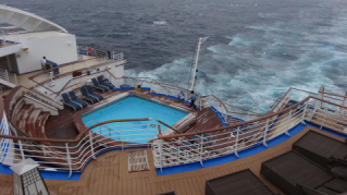 正午近くになり、今後の航海のアナウンスがあり、明日の午後11時に香港に入港するとのこと。阪急情報で10時過ぎの情報では午後2時の入港となっていた