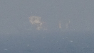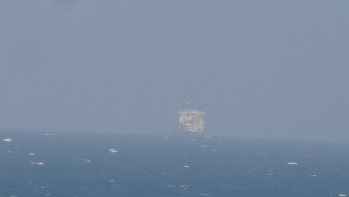 7階のデッキに出て見ると沖合はるかに貨物船が航行している。部屋に戻って部屋のパルコにーから双眼鏡をのぞいて見て確認し、写真撮り。なんとか船影を捕らえられた。だんだんと水平線に消えて行こうとしている。