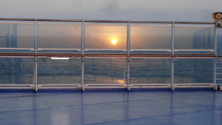 午後5時前に、日没が近いと思い、カメラを持って船尾にいく。まず、スカイウォーカーズクラブへ入り、そこでの夕日を撮影。船尾19階のスポーツエリアに上がり、夕日を撮る。ボードに映る夕日も面白い。月も出ているので、色々と場面を変えて撮影する。