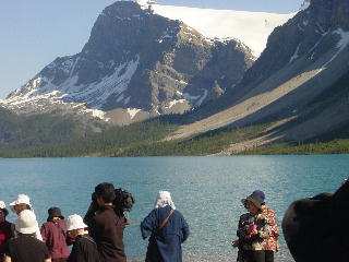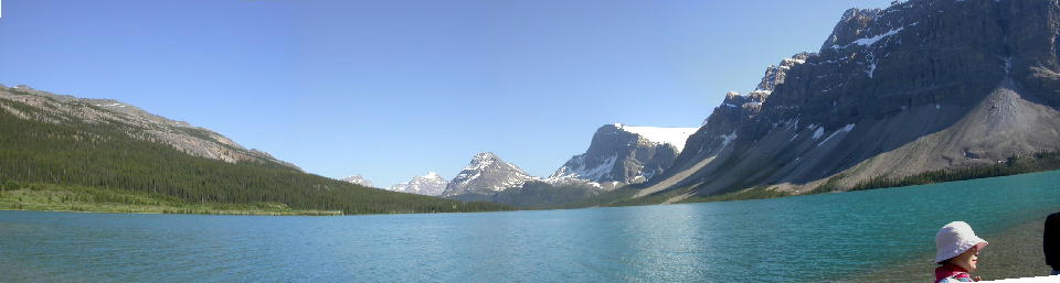 アイスフィールドパークウェイの道路から別れて、ペイトレイクへの道に入る。登り坂を走って駐車場へ。高度が2200mぐらいか。あまり急いで歩 くと息切れがするので、ゆっくり歩くように注意。下って展望台に立つと眼下に氷河湖が見える。青々とした湖水。