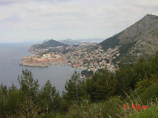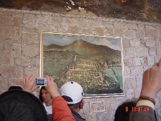長い間、行きたいと思っていたアドリア海の真珠と言われるドブロヴニクにやっと訪れることができた。宮崎駿の「魔女の宅急便」のモデルにもなった というところ。一番に背後の山の上からドブロヴニクの旧市街を眺めたいものと思っていたら、ツアーの中の人がすでに添乗員の山中さんに頼んでいたらしい、 一番に背後の山の中腹にある展望台に案内してくれる。見晴らしがよく、すばらしい眺めを堪能し、写真に納める。それから旧市街・ピレ門前でバスから下車 し、市内観光。以前テレビ報道で内戦によりこの街が爆破されている光景を見たが、下右端の地図のように、たくさんの爆撃に遭い、230人の死者が出たそう である。地図の赤い部分は今でもその惨状を残そうと考え、修理されていない。