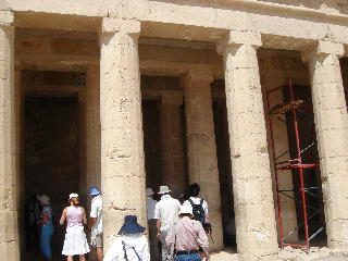 ころ。今では、厳重な警備が行われ安心して見学ができるようになってい る。照りつ ける中で38度の暑さにうだりながら、見て回る。レリーフや壁画の見事さに、見とれ る。観光警察の警備の関係か、11時30分から12時15分 という時間での見学と写真 撮影。もう少し時間がほしいところ。塑像が厳めしさがなく、優雅である。ハトシェ プスト時代の彫刻が一番美しいとガイドのタレッ クさんが解説していたが、見てみる となるほどと納得。 |