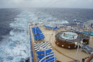 何度もトイ レに通うが、うつらうつらと6時半まで眠る。朝食を8時過ぎまで済ませ、部屋で一休みした後、7階デッキを歩く。時々立ち止まりな がら、白波の写真撮り。今日の風速は10〜15mの強風で波も4mと 高い。従って、歩行できるところも制限されている。船尾で写真撮りをしていると瑠璃子さんが、ダンスで疲れたと言ってやって来た。それでは何か飲もうと7 階のバーに行きコーヒーを。一休みの後、ショップに立ち寄り、オフィシャルキャップと孫の土産物を買って瑠璃子さんとは別れて15階デッキを歩き、7階の インターネットカフェでメールのチェックと読書。
