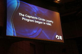 るロイヤルプリンセスの紹介があり、続いて船長挨拶と船長が選んだ招待状で3人にシャンパンがあたる催しがある。その中で大久保さんという日本女性スタッ