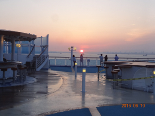 何度もトイレに通い、午前3時半には目が覚め、着替えて15階の上甲板に上がる。関西空港の明かりが見える。午前4時