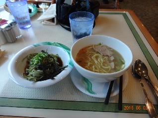 11時半ごろ到着。プリンセスの船首部分を写真に収めて、ホライゾンコートダイニングに上がる。まだお客さんが少ない。ラーメンと茶そばを取り寄せて食