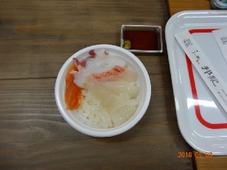 は喉が乾くので、アサヒドライの小瓶をもらう。食べ終わってしばらくすると、レストランの準備が終わり、オープンしたので、お寿司をもらう。バラ寿司。海