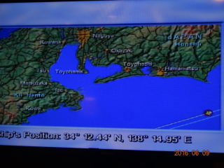 今朝は、7時前に起床。テレビのスキャンディスクで船の位置を確認すると、伊豆半島沖を航行中。上甲板に上がってみる