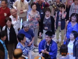 私のカメラで3人が入るようにして撮る。その後、タップダンス、インド踊りの次に盆踊りがある。イカ踊り、東京音頭などを大勢で踊り、終わる。