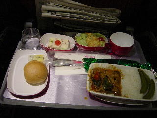 定刻の16時55分に搭乗口を離れ、17時20分頃テイクオフ。18時過ぎにスナックと飲み物が出る。赤ワインを。スナックは山形の菓子メーカー製品。その後間もなく夕食。牛丼とタイ米カレーの選択。私はカレー。家内は牛丼。どちらもまずまずの味。バンコクまで5時間55分のフライト。23時、現地時間21時に着陸。駐機場に移動。いざ降りようとすると、電氣系統の故障でドアが開かないとのアナウンス。しば らく着席。やっと降りてバスでターミナルへ。現地時間9時半、手荷物検査。ベルトを取れ、靴を脱げと言われる。パソコンはケースに入れたままでよいとのこ と。搭乗口E9。その近くまで移動。相当歩かされる。約2時間のフリータイム。ベンチを探してへたりこむ。