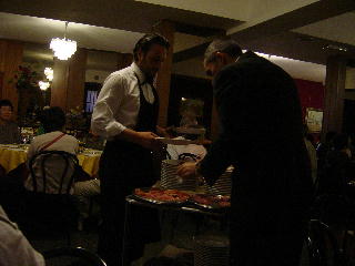 昼 食後は、来た道をたどってサンマルコ広場に。カメラ撮りをしながら、海上タクシー乗り場に。この乗り場の東先は、以前、見たNHKの「世界ふれあい街歩 き」で辿り着いたところ。海 上タクシーの船上から、ベネチアの街並みを眺める。ギリシャ行きだろうか、大型のフェリーとすれ違う。もう二度と来ることもない、街並みをまぶたに焼き付 けるように何度も見返す。バ スの駐車場にもどり、バスに乗車。フィレンチェヘ。フィレンチェ近くのとあるホテル のレストランで夕食。地下一階で広い食堂。きちんとしたウェーターが料理を付け分けてくれる。