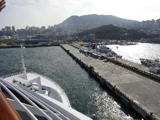 釜山で下船するため、午前7時45分の集合ということで、今朝は5時に起床し5時半に14階のホライゾンコートで朝食。スモークサーモンとサラミソーセージ一枚、ヨーグルト、スイカとパイン、お粥を食べる。飲み物は牛乳とコーヒー。朝早かったが、お客さんが次々とやってくる。客室に戻り、しばらくベットに横になり、読書。7時半に集合場所のマーキスダイニングに。入国審査票をM添乗員が集める。後で説明があったが、この入国審査票は台湾入国用であったとのこと。韓国側の入国係員からの連絡で、パスポートの写しとクルーズカードで入国できるようになった。