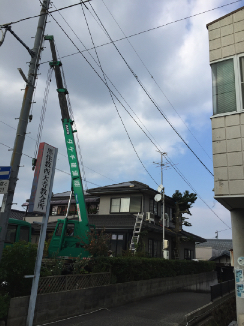 いところを何度も切り返しをして庭に入ってもらう。クレーンも電線にかからないようにあげ、早速、上部を引っ掛けてもらい、チェンソーで切り落とす。切り
