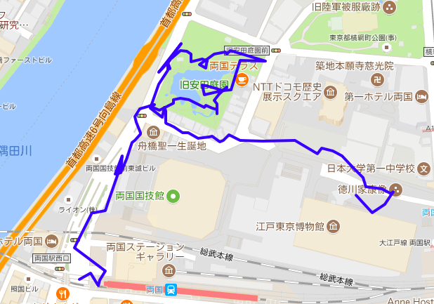 両国駅から国技館、旧安田庭園を見て、江戸東京博物館までの経路