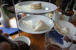 11時 15分出発。約2時間でウィンダミア湖のレストランに到着。アフタヌーンティーの昼食。サンドウィッチ、スコーン、ケーキ。飲み物は私のみ店主お勧めの エールをいただく。4.4ポンド。食事を済ませてか らバスで湖畔に送ってもらい、約2時間のフリータイム。ベアトリック・ポッターのミュージアムに行く。