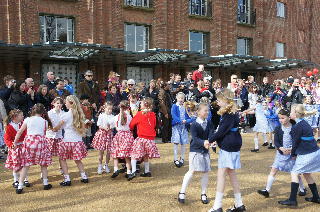 エイボン 河畔のシティ・ホール前ではダンスや演奏が行なわれている。4,5人によるフォーク音楽の演奏が済んだ後、子どもたちの各グループが呼び集められ、フォー クダンスの練習。だいぶん慣れたところで、音楽に合わせて一斉に踊る。