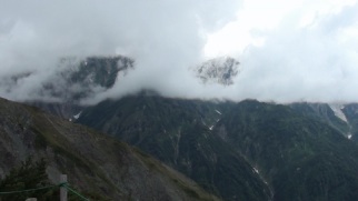 12時半にゴンドラとリフトを二回乗り継ぎ。八方池山荘へ到着。霧が頂上を隠し、展望はよくない。下界はよく見える。近場の草原では、ウメバチ草、ツルガネニンジン、アザミ、リンドウなどの草花が咲き乱れ、目を楽しませてくれる。