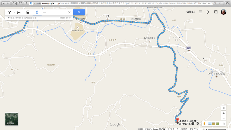 あまりおなかが空いていなかったので、笊そば一杯と、高菜と南京のオヤキを1つずつ注文。1,080円。ソバには生わさびと二種類のつけもの。つけ汁は2人分つけていただく。オヤキも高菜のものを半分もらうが美味しいものであった。 小川の庄おやき村行程図 ナビ記録図