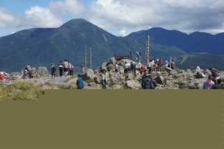 頂上に上がるとすばらしい眺望。教えてもらい、蓼科山、八ヶ岳、南アルプス、中央アルプス、北アルプス、そして、浅間山や白根山を見るが、蓼科山以外は