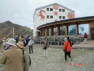 登りかけて、下を見下ろすとベルニナ特急の列車が走っているのが見られる。上にあがると 氷河全体が俯瞰できる。ただ、ガスが掛かって山頂は望めなかった。説明を聞いた後、見晴らしの良いところへ移動して、写真取り。瑠璃子さんとI夫人が氷河 に歩いている人が見えるという。なかなか見えない。ようやく確認でき、単眼鏡でのぞきこんで見ると確かに歩いている。あちこちにいる。しばらくすると、頂 上レストランの前に、温泉があると添乗員のMさんが案内。側に行って手をつけてみるとぬるい。しかも回り込んでみると薪がおいてあり、焚き口もある。沸か しているのだ。12時45分には集合というので、早めに集合所に移動。トイレを済ませて、待合室で休んでいる。われわれの一行の若奥さんと子どもが高山病 になりかけていたのだろう、気分が悪いので休ませてほしいとのことで、席を替わってあげる。しばらくすると少し落ち着き、一緒にロープウェーで下山。バス に再びに乗って、ティラノへ。