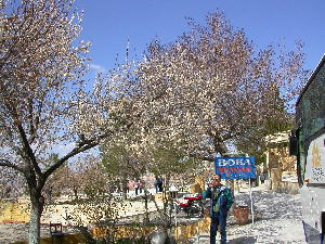 ギョレメ村にあるタネルさんのお知り合いのおばあさんを訪ねる。キノコ型の岩山の谷を歩く。杏の花が咲いている。のどかな風景である。