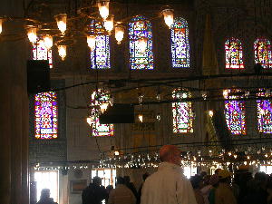 ブルーモスクはスルタンアフメッド・ジャミィと言われ、トルコを代表するイスラーム寺院である。6本のミナーレをもち、直径27.5mの大ドー ム、4つの副ドームに30の小ドームを持っている。内装のモザイク模様のタイルが美しい。大勢の見物人で一杯である。