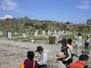 野外劇場を見学した後、観客席の上部から、アテネ神殿、ベルガモン図書館跡を見る。跡形もなく、石畳と列柱の一部がごろごろとしている。ベルガモ ンの図書館の何万点という資料が、クレオパトラの所望をアントニウスが受け入れてアレクサンドリアに運ばれ、結局そこですべて焼失してしまう。