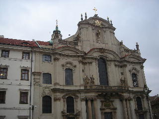 カレル橋や対岸の教会などが見える。プラハ城から長い石段を下り、カレル橋に向かう。カレル城から坂道を下ったところがマラー・ストラナ広場。聖ミクラーシュ(セント・ニコラス)教会が建ってお り、この教会のオルガンをモーツァルトがよく弾いていたとのこと。また、モーツァルトが亡くなったときの追悼ミサがこの教会で行われ、参拝者が4,000 人も集まったとか。教会の真向かいの建物が音楽学校で、特に弦楽器の指導に優れており、日本人も多く学んでいるそうである。