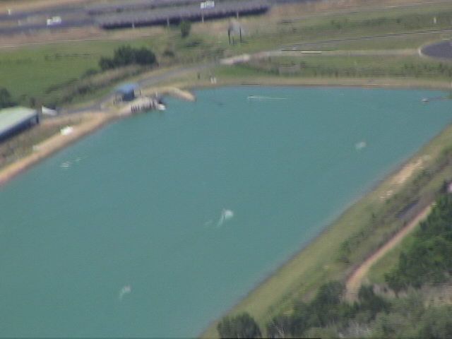 ロープウエーから見た水上スキー練習場。ぐるぐる回るワイヤーで引っ張っている。
